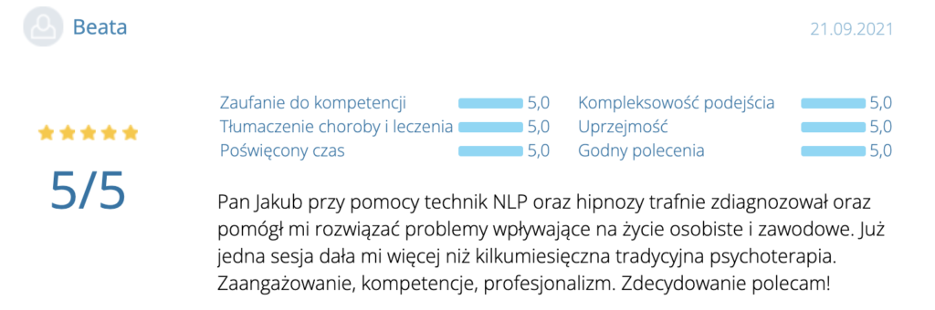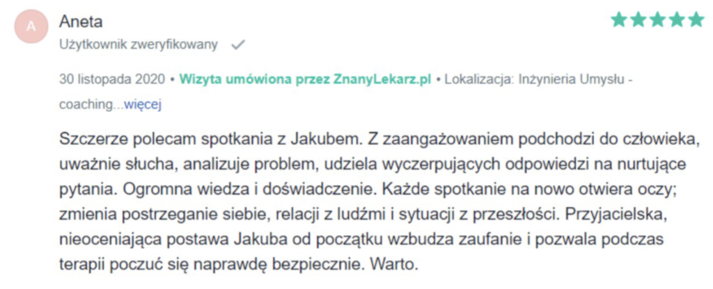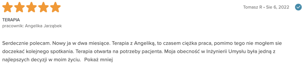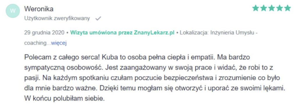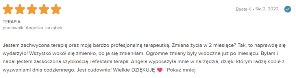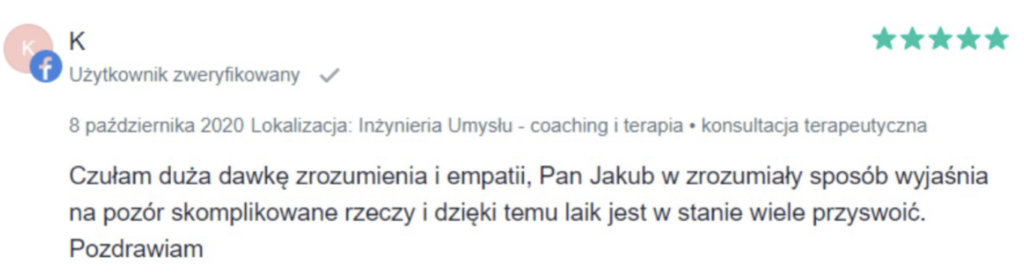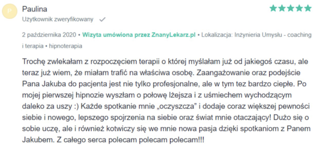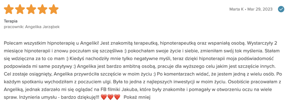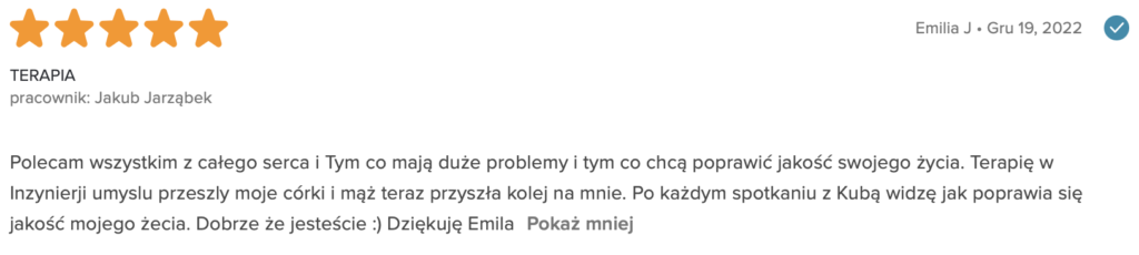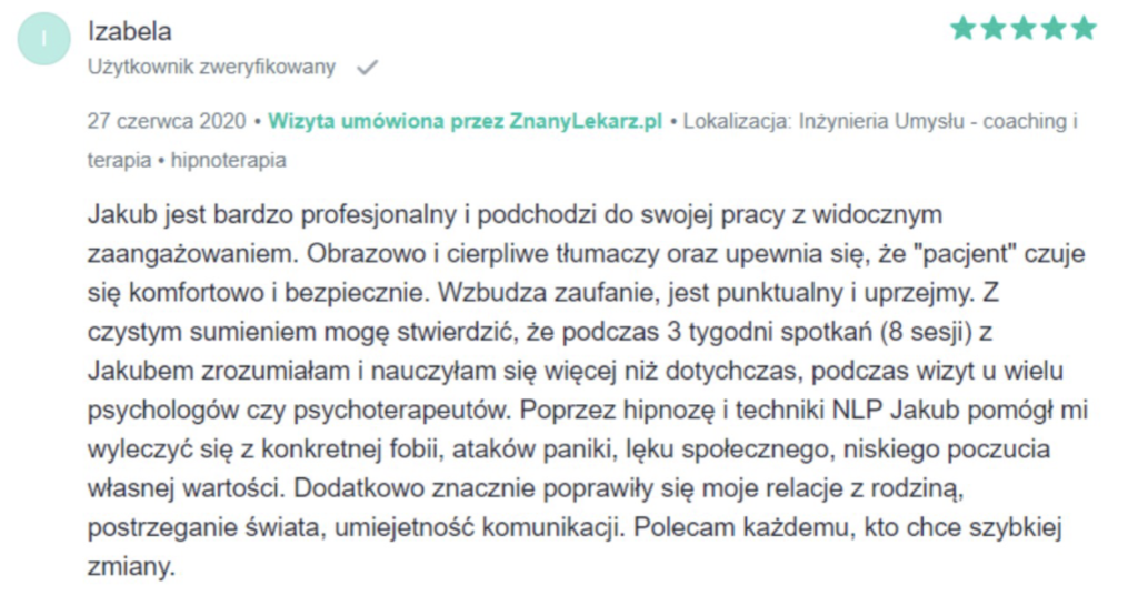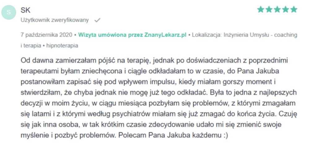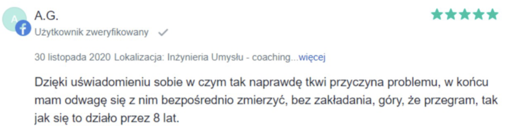 „Polecam z całego serca. Terapię miałam 2 lata temu. Trafiłam do inżynieria umysłu w momencie totalnego zagubienia, niskiej samooceny oraz chęci odejścia z tego świata. Teraz mam wiarę w siebie, zrozumiałam z czego wynikały moje problemy i nauczyłam się radzić z nimi. Zawsze byłam postrzegana jako silna kobieta a w środku umierałam z bólu psychicznego. Dziękuję Wam bo teraz jestem silna i znam swoją wartość. Odzyskałam kontrolę nad życiem prywatnym i zawodowym. Dziekuje :)”