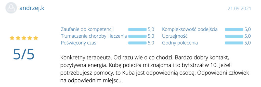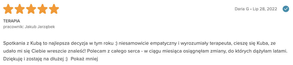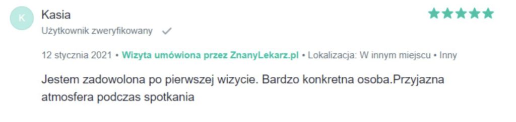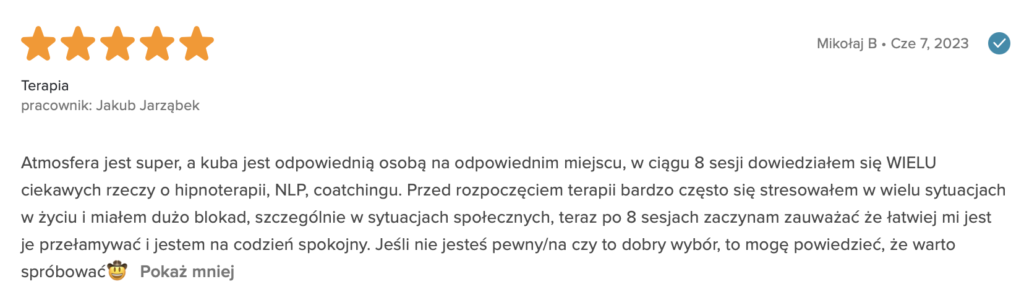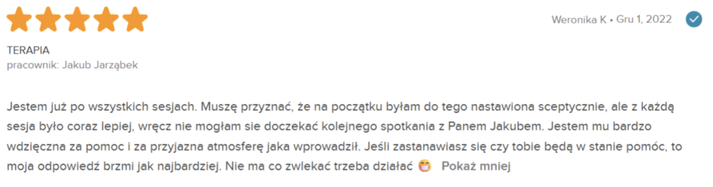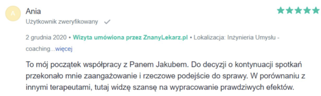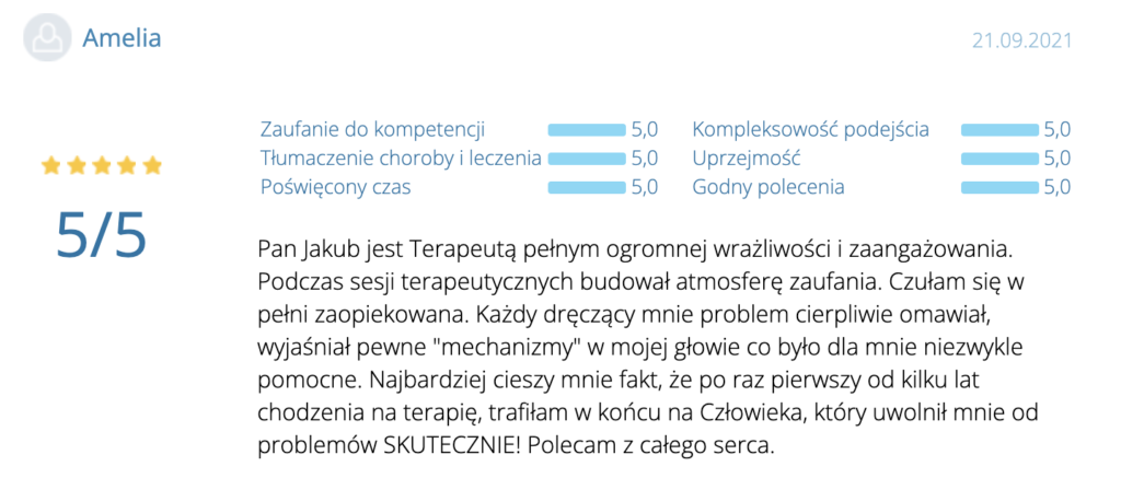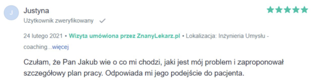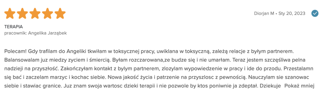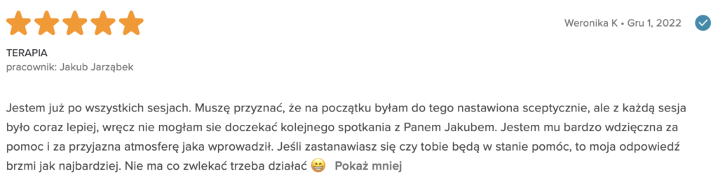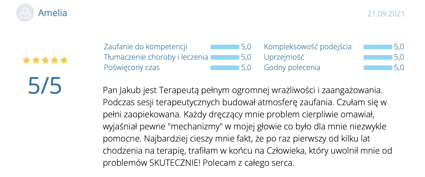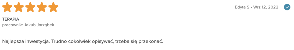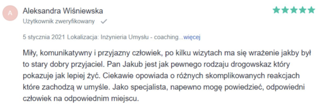 „Polecam z całego serca. Terapię miałam 2 lata temu. Trafiłam do inżynieria umysłu w momencie totalnego zagubienia, niskiej samooceny oraz chęci odejścia z tego świata. Teraz mam wiarę w siebie, zrozumiałam z czego wynikały moje problemy i nauczyłam się radzić z nimi. Zawsze byłam postrzegana jako silna kobieta a w środku umierałam z bólu psychicznego. Dziękuję Wam bo teraz jestem silna i znam swoją wartość. Odzyskałam kontrolę nad życiem prywatnym i zawodowym. Dziekuje :)”